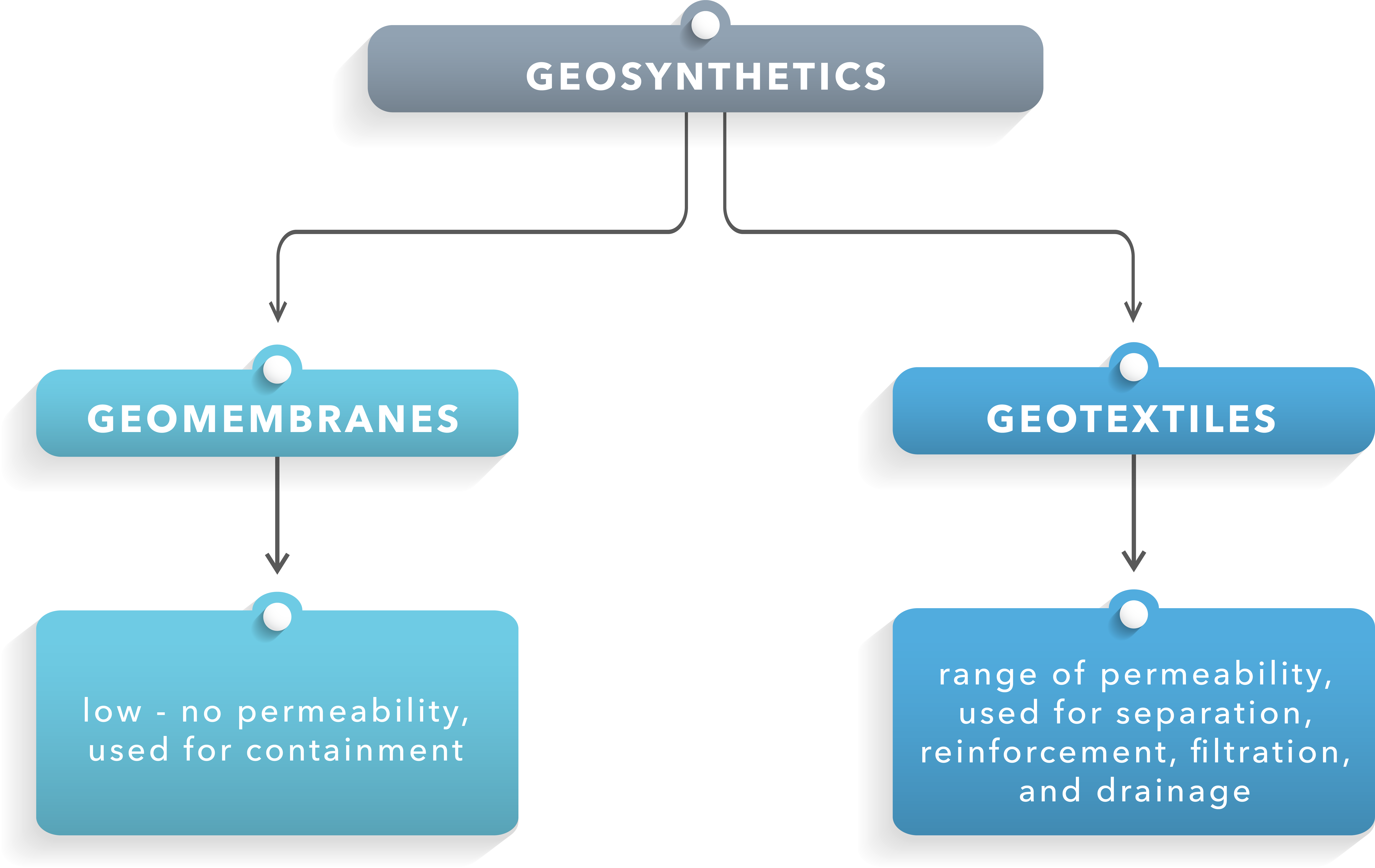 While there are several kinds of geosynthetics, the category can be loosely separated into geotextiles and geomembranes.